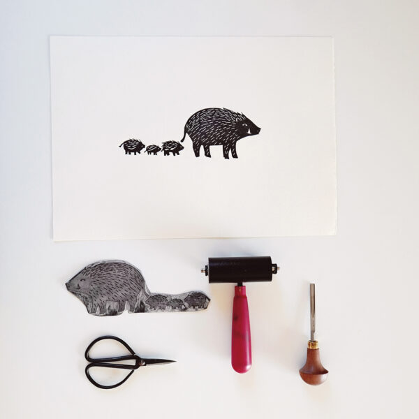 Ręcznie drukowany linoryt na czerpanym papierze graficznym.